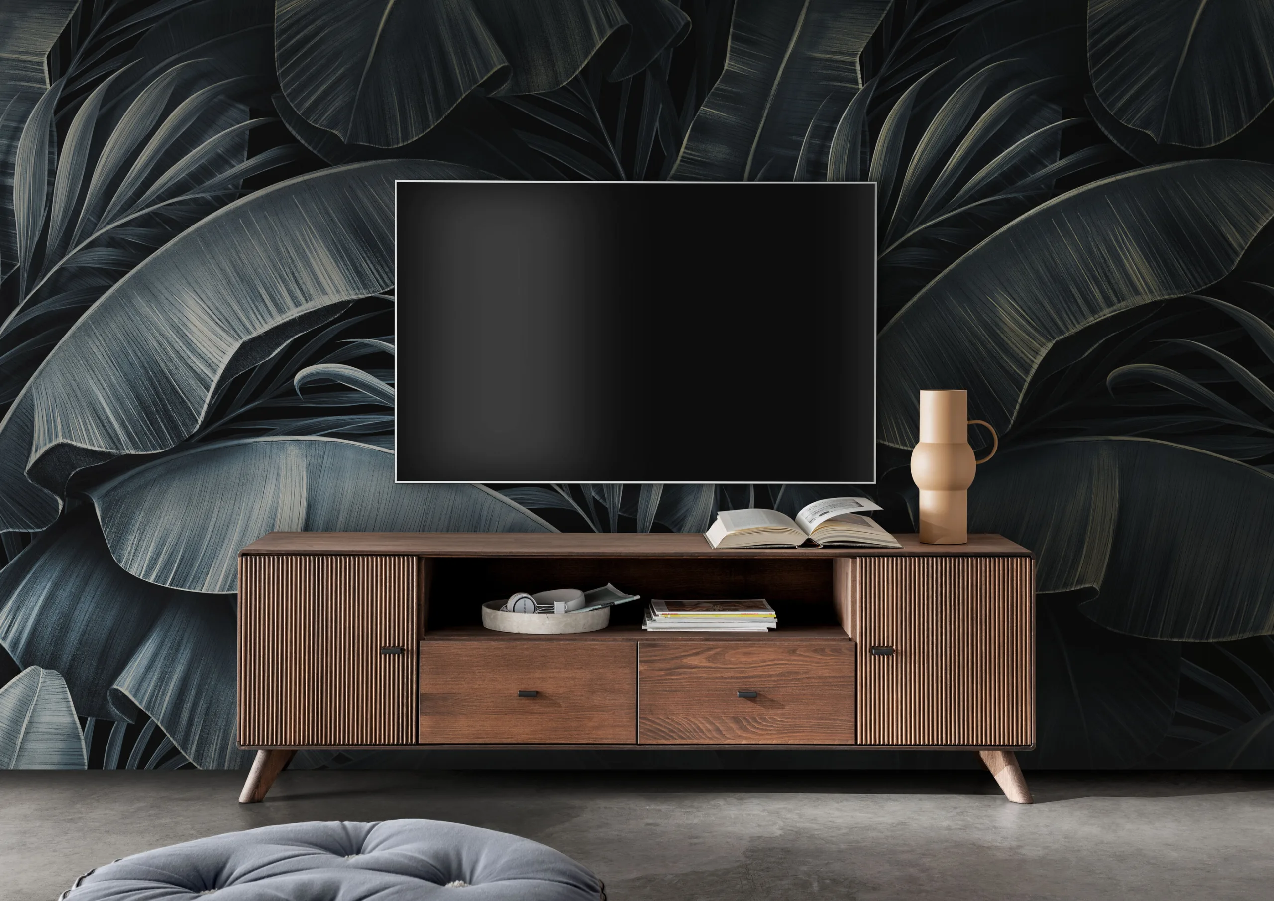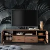 Le meuble II WZ-0624 gagne en légèreté visuelle grâce à ses pieds minimalistes. Les armoires, tiroirs et espaces ouverts offrent de nombreux rangements pour les équipements électroniques, accessoires et documents. La couleur sombre du meuble et la façade rainurée s’intègrent parfaitement dans un salon ou une salle à manger au style design.