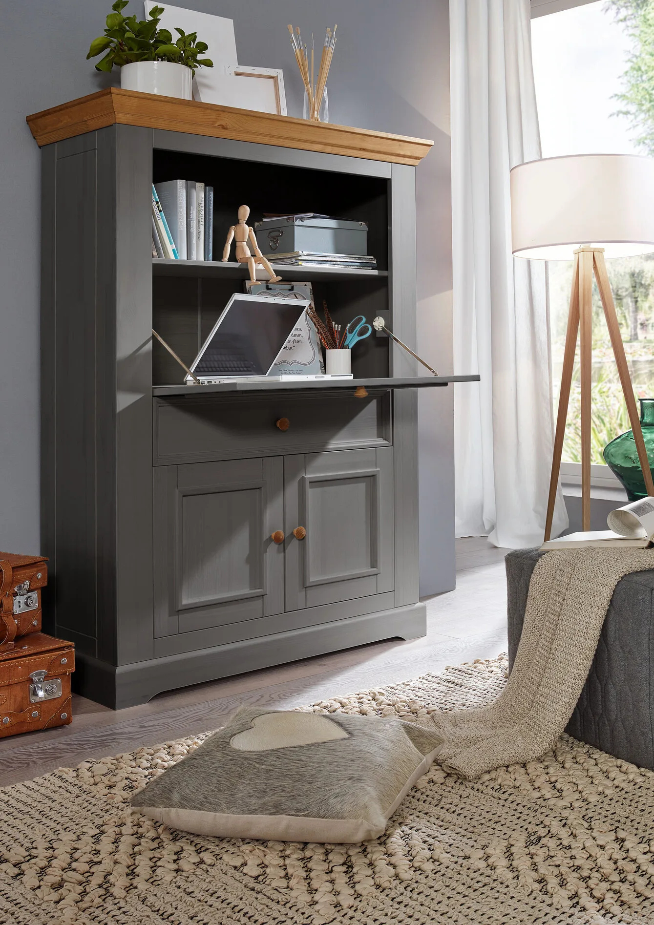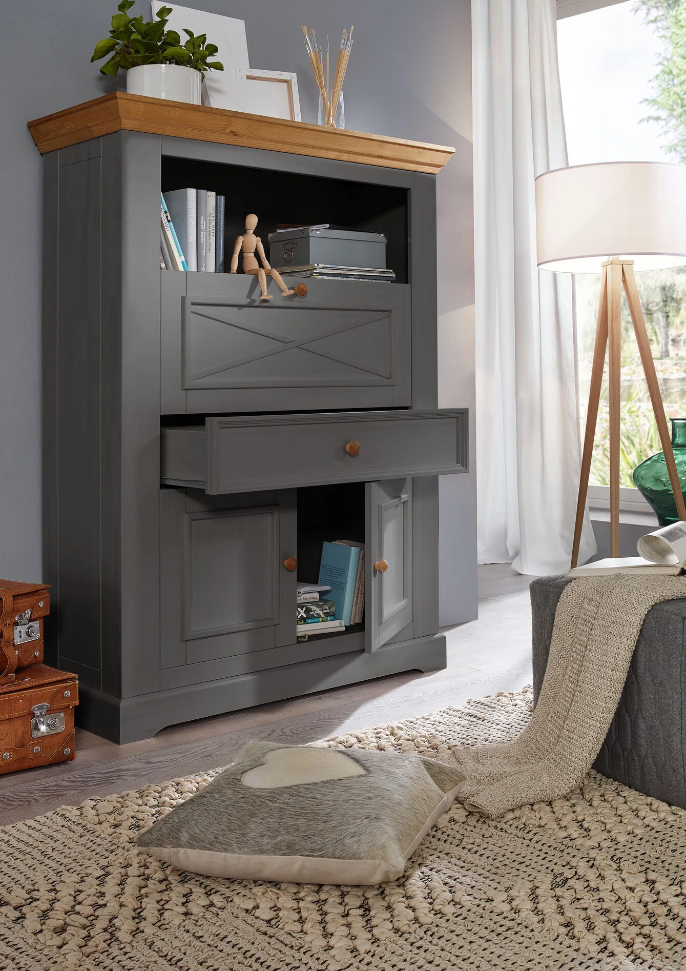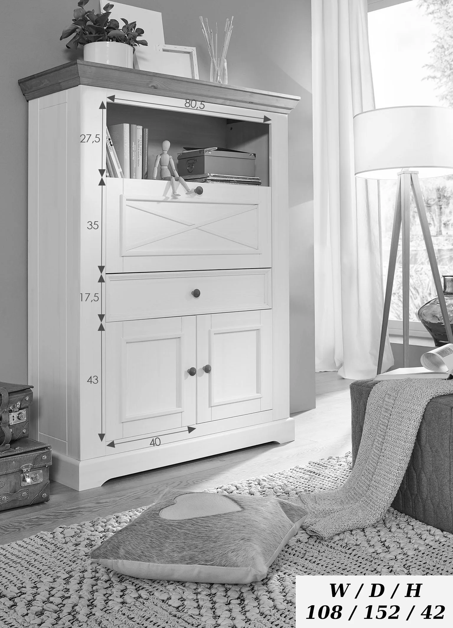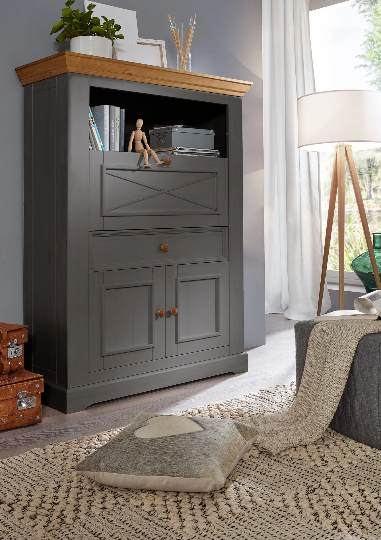 Fabriqué en bois de pin massif et ciré gris, ce meuble est à la fois pratique et élégant pour ranger des objets personnels. Sa texture naturelle et sa durabilité, combinées à la finition grise, lui confèrent un charme unique tout en garantissant une solidité pour les années à venir. Des détails esthétiques, comme les poignées rondes, ajoutent une touche sophistiquée qui s’harmonise parfaitement avec divers styles de décoration intérieure.