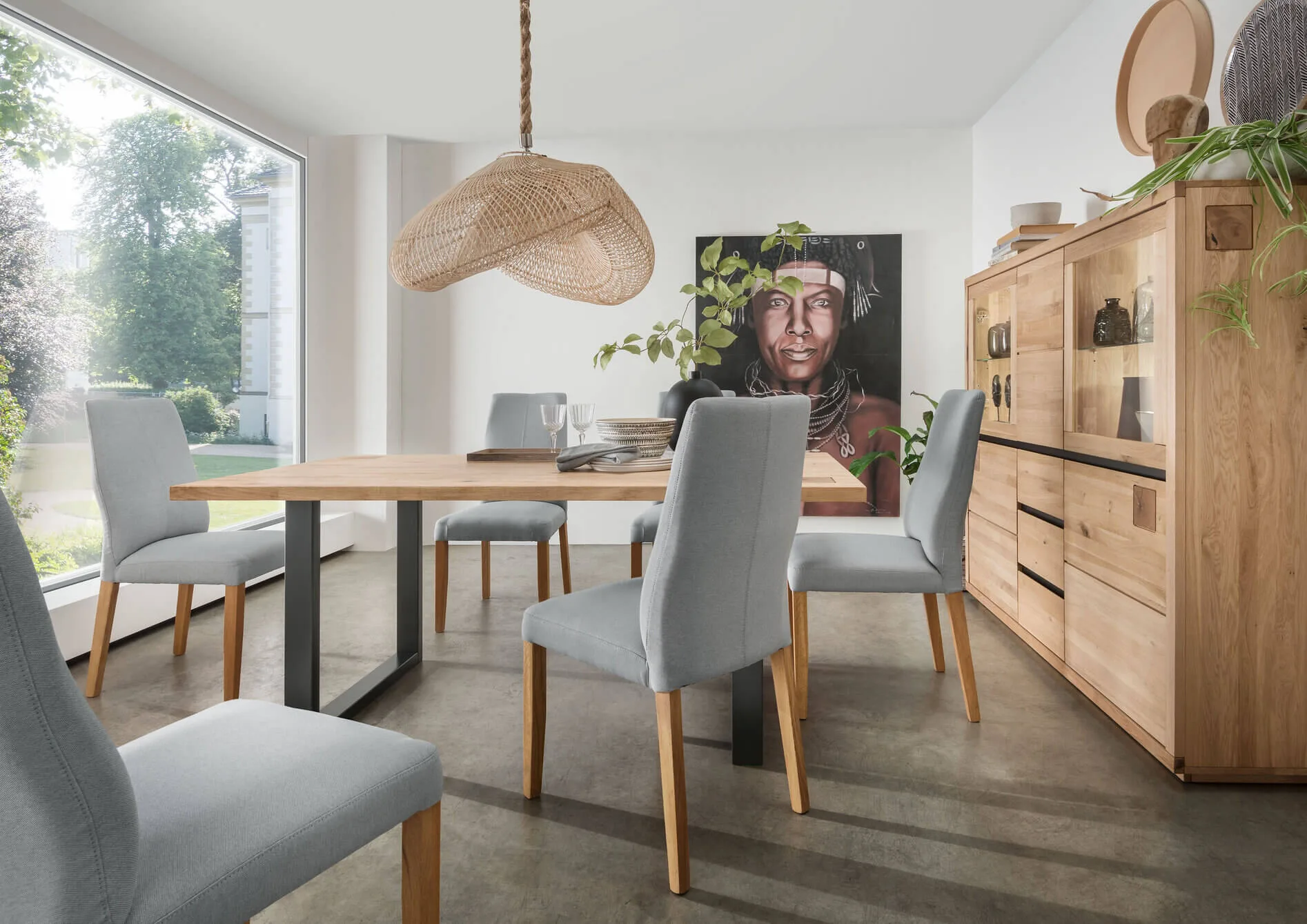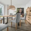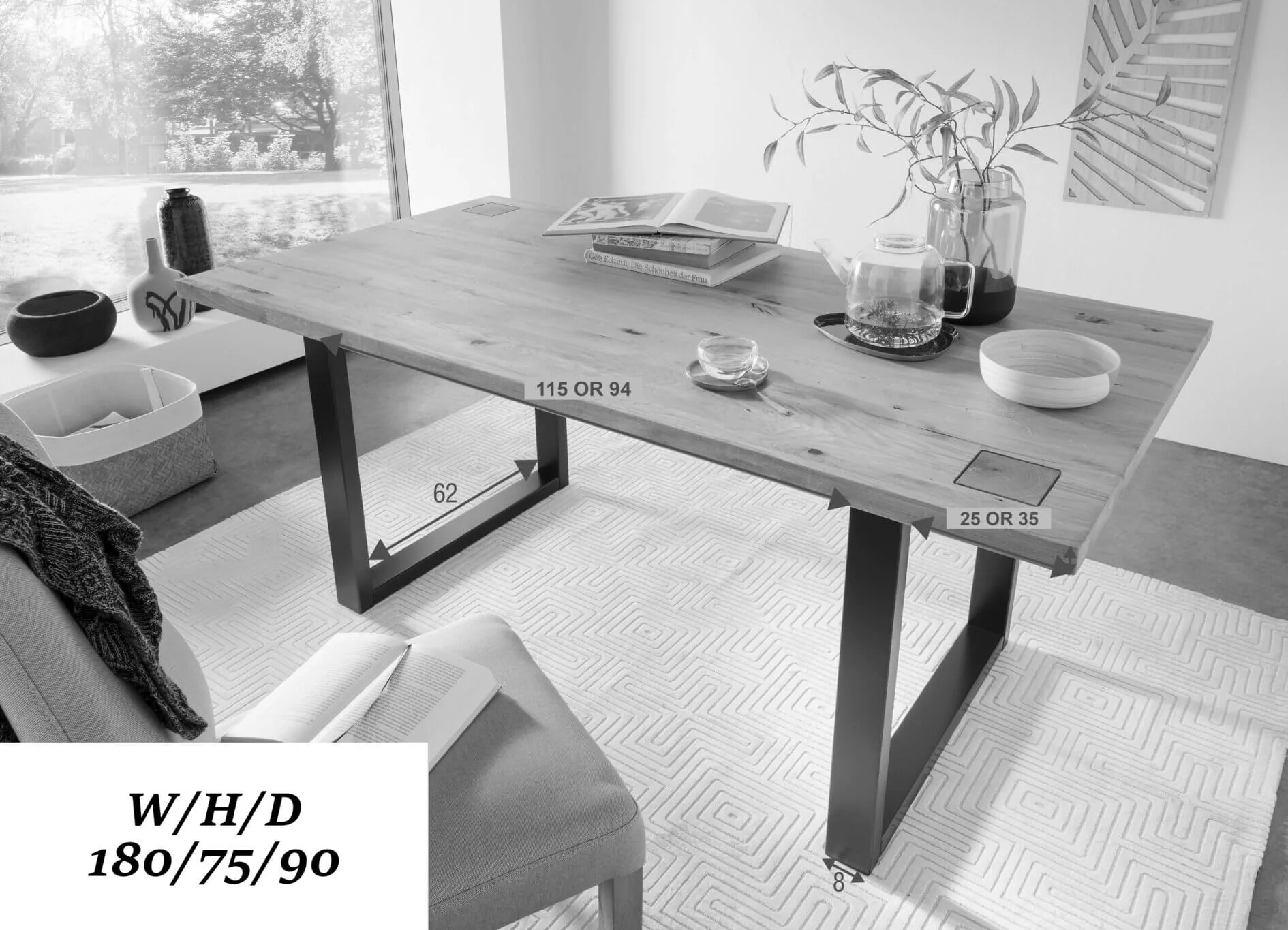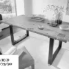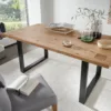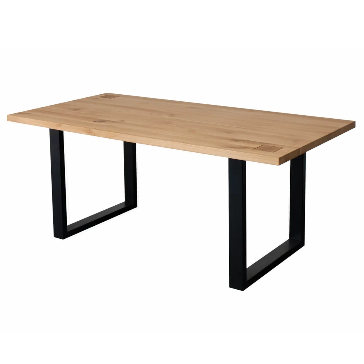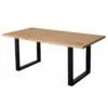 La table 180×90 est dotée d’un épais plateau en chêne massif et d’une base en métal stable. Avec ses nœuds naturels, son grain et sa couleur, elle présente un design intéressant et original. L’élément qui attire l’œil est constitué par les petits carrés découpés aux extrémités des poutres, visibles dans les deux coins du plateau.